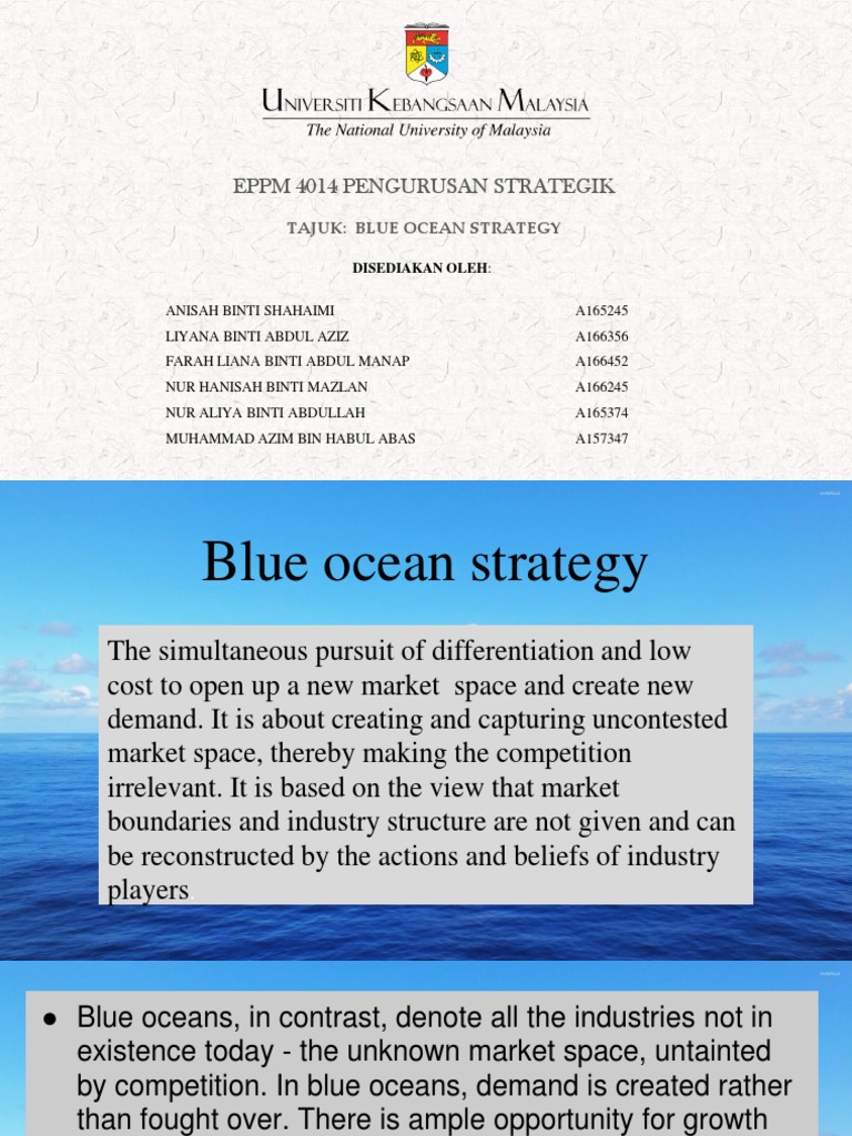 Banca țiriac adriana pita head of marketing & corporate communication. Malaysia is making a blue ocean shift in its national development as it strives to become an advanced nation by 2020. Blue ocean strategies are a form of business level strategies that enable firms to achieve sustainable competitive advantage by tapping uncontested market space. The government of malaysia introduced the national blue ocean strategy (nbos) summit to start innovative strategies for creating a change in the society at a lower cost. The blue ocean strategy is oriented towards innovative businesses.