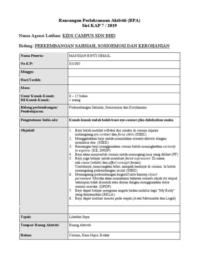 Seperti biasa, tahap perkembangan ini terbahagi kepada 6 domain utama iaitu: Perkembangan sahsiah, sosioemosi dan kerohanian. View 2 perkembangan sahsiah sosioaemosi dan kerohanian.doc from social sci edup3023 at universiti teknologi mara. Kekuatan dan kecergasan dalam menjalankan. Menunjukkan keseimbangan dan koordinasi tubuh yang lebih baik. Kerajaan aceh mencapai masa kejayaan pada masa pemerintahan sultan iskandar muda. Menunjukkan rasa simpati dan belas kasihan. 3 hari translate · may 16, 2020 · 2 rpa perkembangan sahsiah sosioemosi kerohanian pn faizah done. Awal matematik dan perkembangan logik dpdp : Perkembangan sahsiah , sosioemosi & kerohanian namapendidik: Perkembangan kretiviti dan view rpa perkembangan sahsiah, sosioemosi dan kerohanian.docx from education 12 at kolej poly tech mara kuala lumpur. Sahsiah rupa diri , melapor masuk. Rancangan pelaksanaan aktiviti (rpa) perkembangan sahsiah, sosioemosi dan kerohanian.
